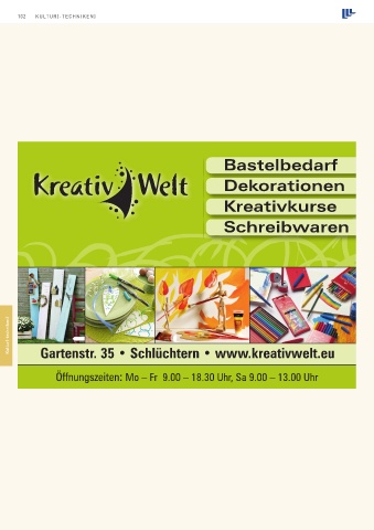 102 102 KULTUR(-TECHNIKEN) Bastelbedarf Dekorationen Kreativkurse Schreibwaren Kultur(-techniken) Gartenstr. 35 • Schlüchtern • www.kreativwelt.eu Öffnungszeiten: Mo – Fr 9.00 – 18.30 Uhr, Sa 9.00 – 13.00 Uhr