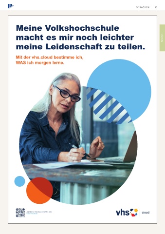 SPRACHEN 43 43 Meine Volkshochschule macht es mir noch leichter Sprachen meine Leidenschaft zu teilen. Mit der vhs.cloud bestimme ich, WAS ich morgen lerne. Jetzt bei der vhs.cloud anmelden unter www.vhs.cloud