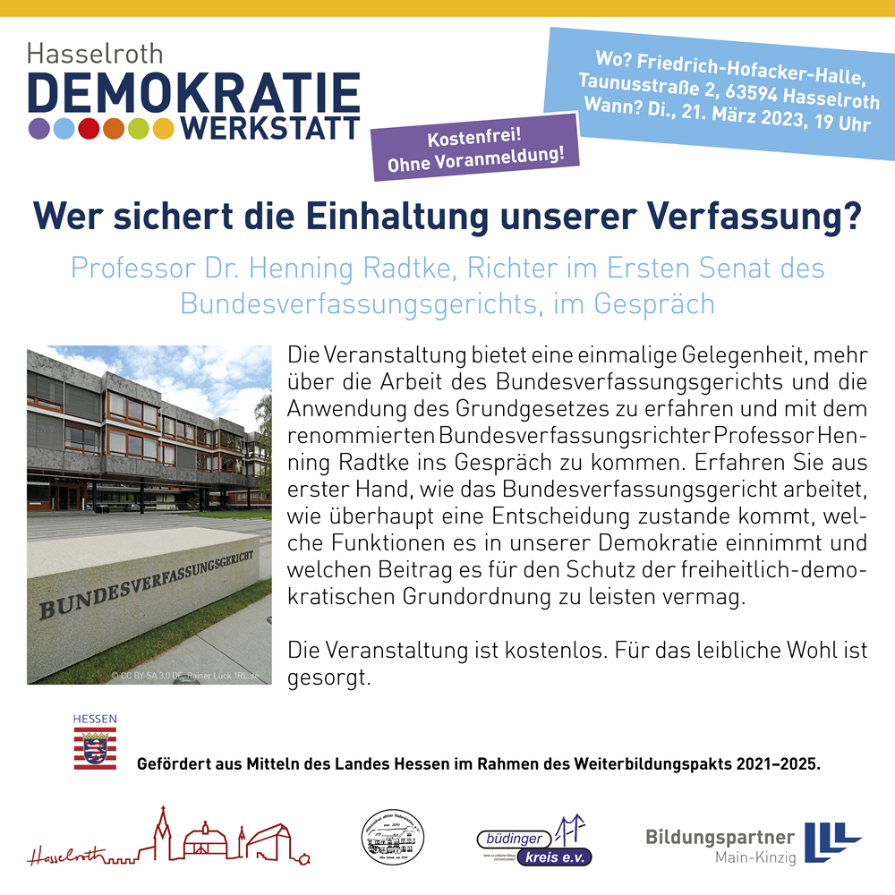 Die Demokratiewerkstatt Hasselroth lädt in Kooperation mit dem Aktionskreis Aktives Niedermittlau, dem Büdinger Kreis e. V. – Verein zur politischen Bildung & Kommunikation und der Bildungspartner Main-Kinzig herzlich ein, mit Verfassungsrichter Professor Radtke zu diskutieren. Die Teilnahme ist kostenlos, für das leibliche Wohl ist gesorgt.