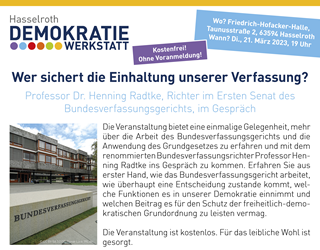 Die Demokratiewerkstatt Hasselroth lädt für Dienstag, 21. März, ab 19 Uhr, in die Friedrich-Hofacker-Halle nach Niedermittlau zu einer Veranstaltung mit dem renommierten Bundes-verfassungsrichter Professor Henning Radtke ein.