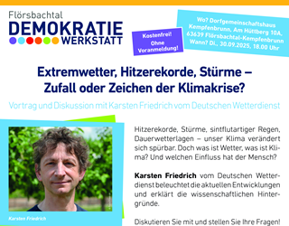 Nachdem der ursprünglich geplante Termin ausfallen musste, wird die Veranstaltung nun nachgeholt. Nutzen Sie die Gelegenheit, direkt von einem Klimatologen mehr über Extremwetter und Klimakrise zu erfahren!