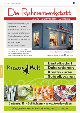 104 104 KULTUR(-TECHNIKEN) Bastelbedarf Dekorationen Kultur(-techniken) Kreativkurse Schreibwaren Gartenstr. 35 • Schlüchtern • www.kreativwelt.eu Öffnungszeiten: Mo – Fr 9.00 – 18.30 Uhr, Sa 9.00 – 13.00 Uhr