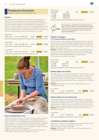 10.03.-19.05. 9-mal Mi. 19:30-21:30 24 UE 2601003 96,00 € Nachmittag und entdecken Sie die Freude am Töpfern. Sie werden be-